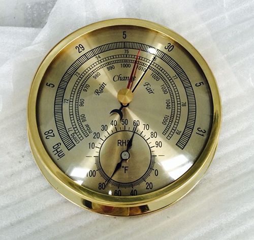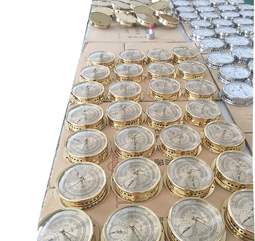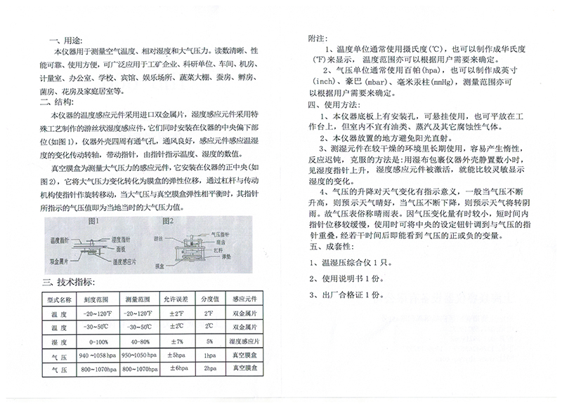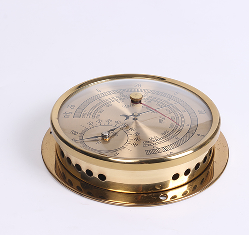 空盒气压表又称固体金属气压表。是一种轻便的测定大气压力的仪器。它是利用大气作用于金属空盒上(盒内接近于真空)的压力,使空盒变形,通过杠杆系统带动指针,使指针在刻度盘上指出当时气压的数值。空盒气压表不如水银气压表jing确,一般台站只作参考仪器,多用于野外观测。